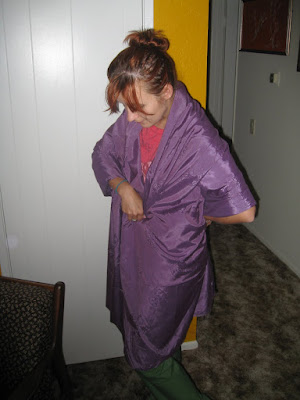 I heard about using long TShirt but I couldn’t find one I disliked enough to trash, and then I read feeback about it adding bulk, so I wore a trash bag (thoughtfully cut out head hole and arm holes) and since that was too short and I wanted my butt wrapped, I wore a contrasting trash bag skirt.